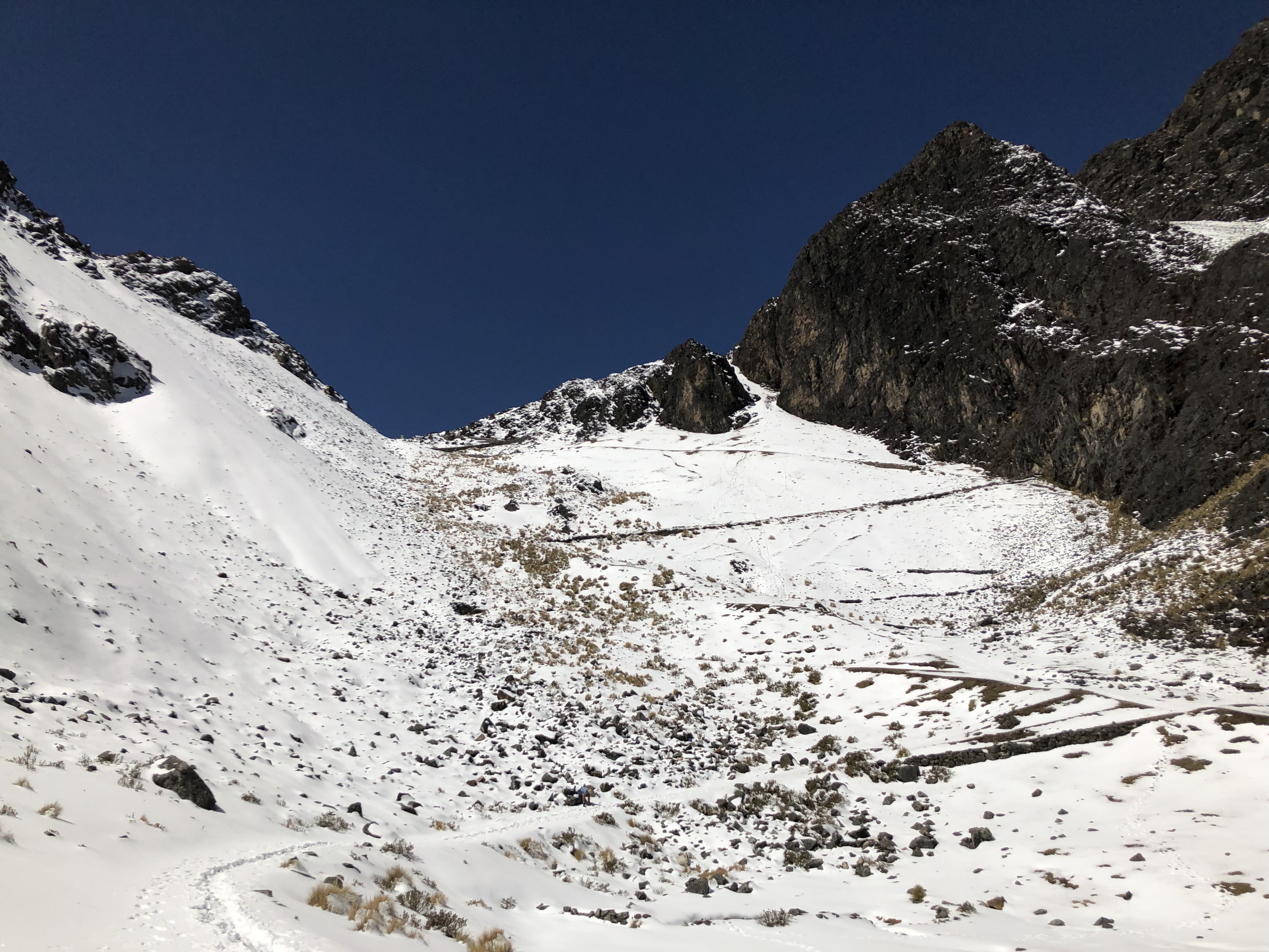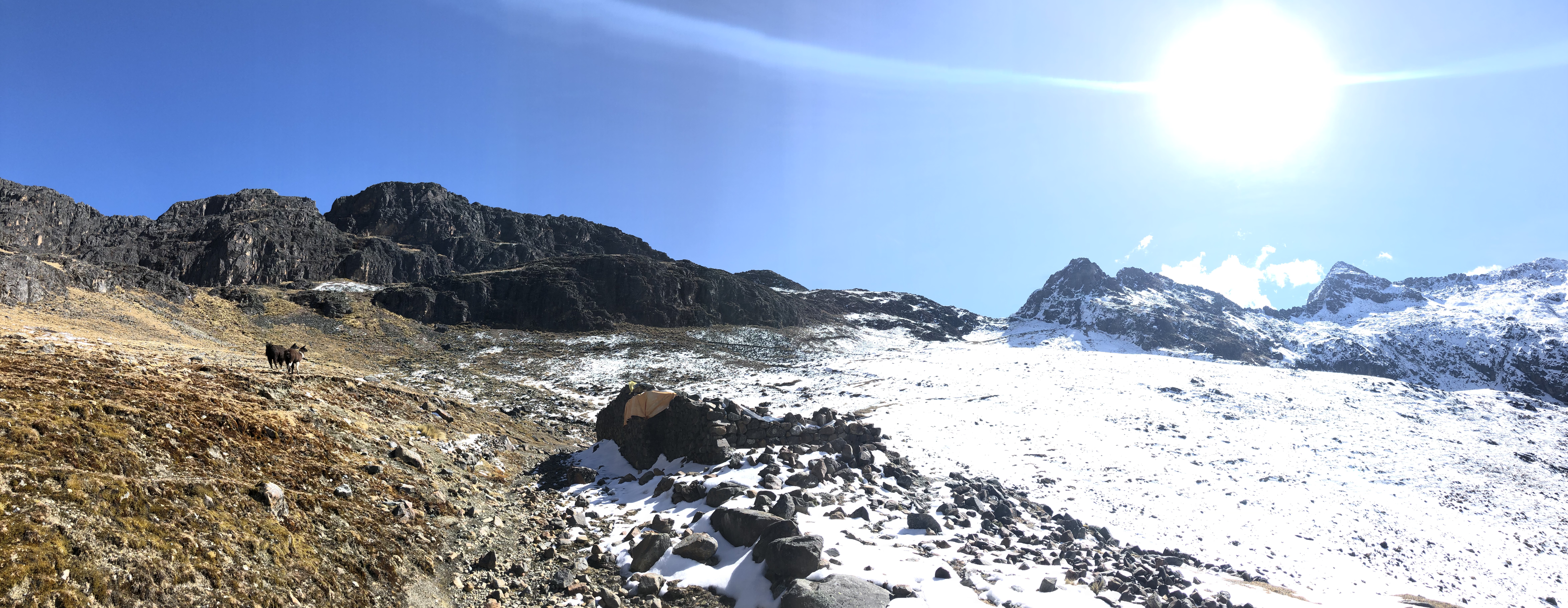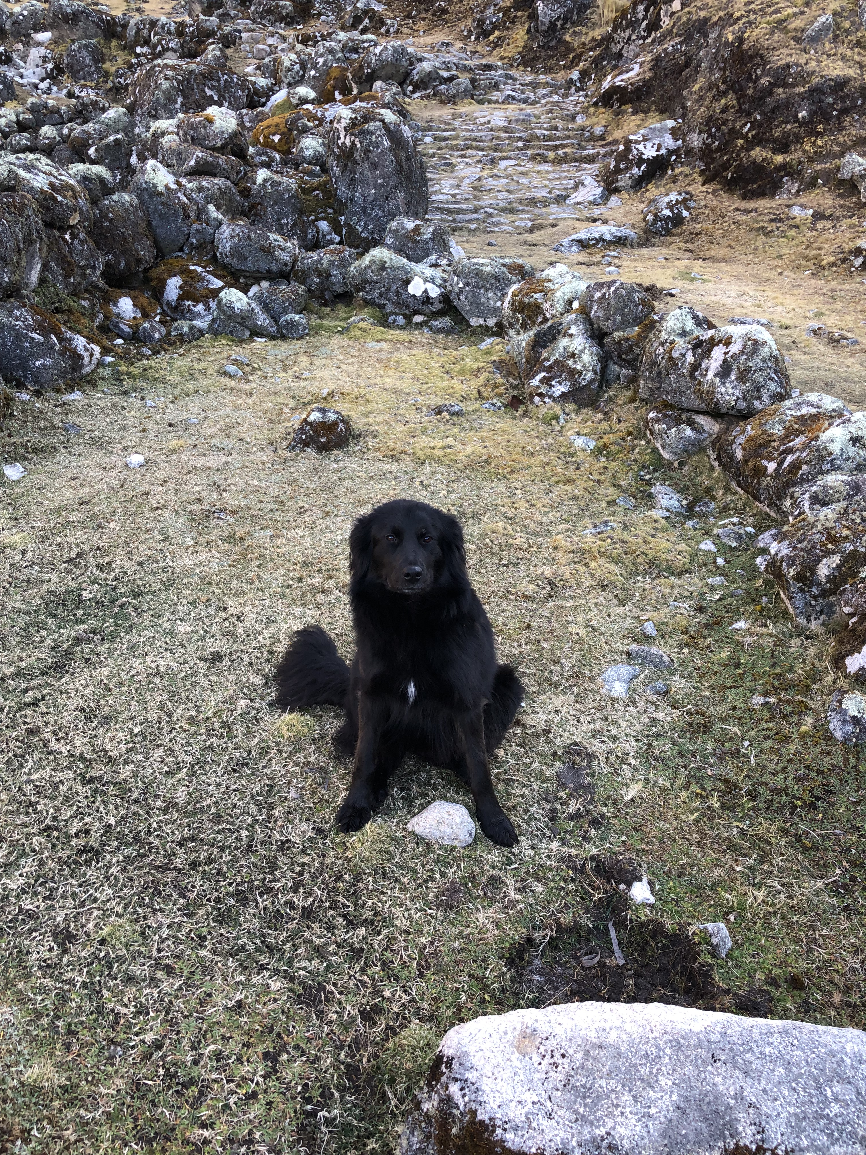 Also saw some large gliding birds. Lyle, Joe and Alex had walked ahead a bit to push on towards the campsite for the night, whilst jodh was a little behind. Without another human in site, a black dog came sprinting at me from the distance with its mouth open. Alone in the Andes, on a trail which isn’t too common (Lyle’s parents did it years ago, and named lyles sister Takesi after the trail, so Lyle knew about the trail and suggested it), I was thinking “The dog is probably nice, most dogs are, but what if it’s not and has rabies or trying to protect the llamas?”. I picked up a rock for the small chance I had to protect myself against a rabid dog. After the dog reached me and wanted nothing more than to be fussed, to my delight and relief, I put the rock down and gave it all the attention it wanted.