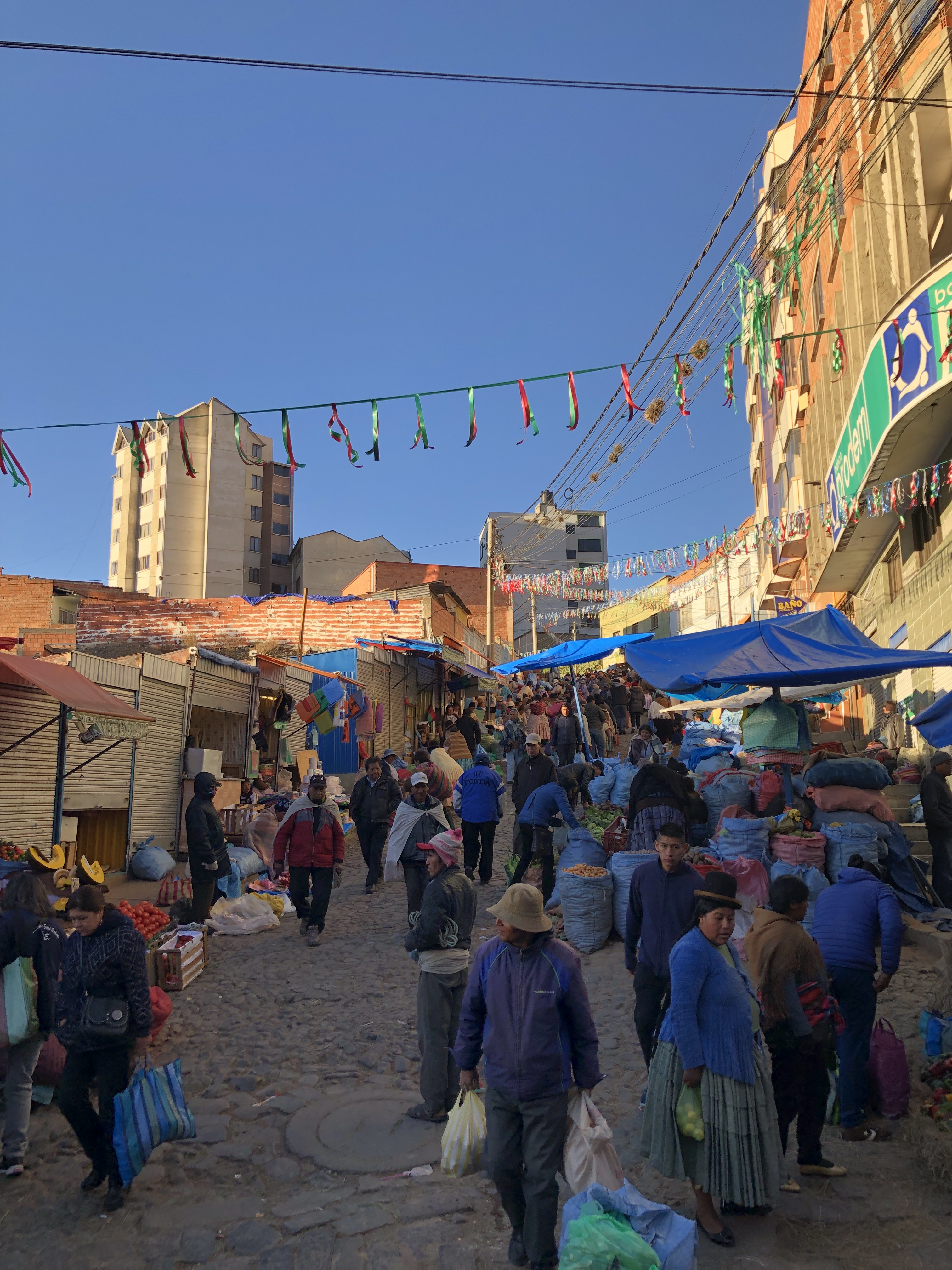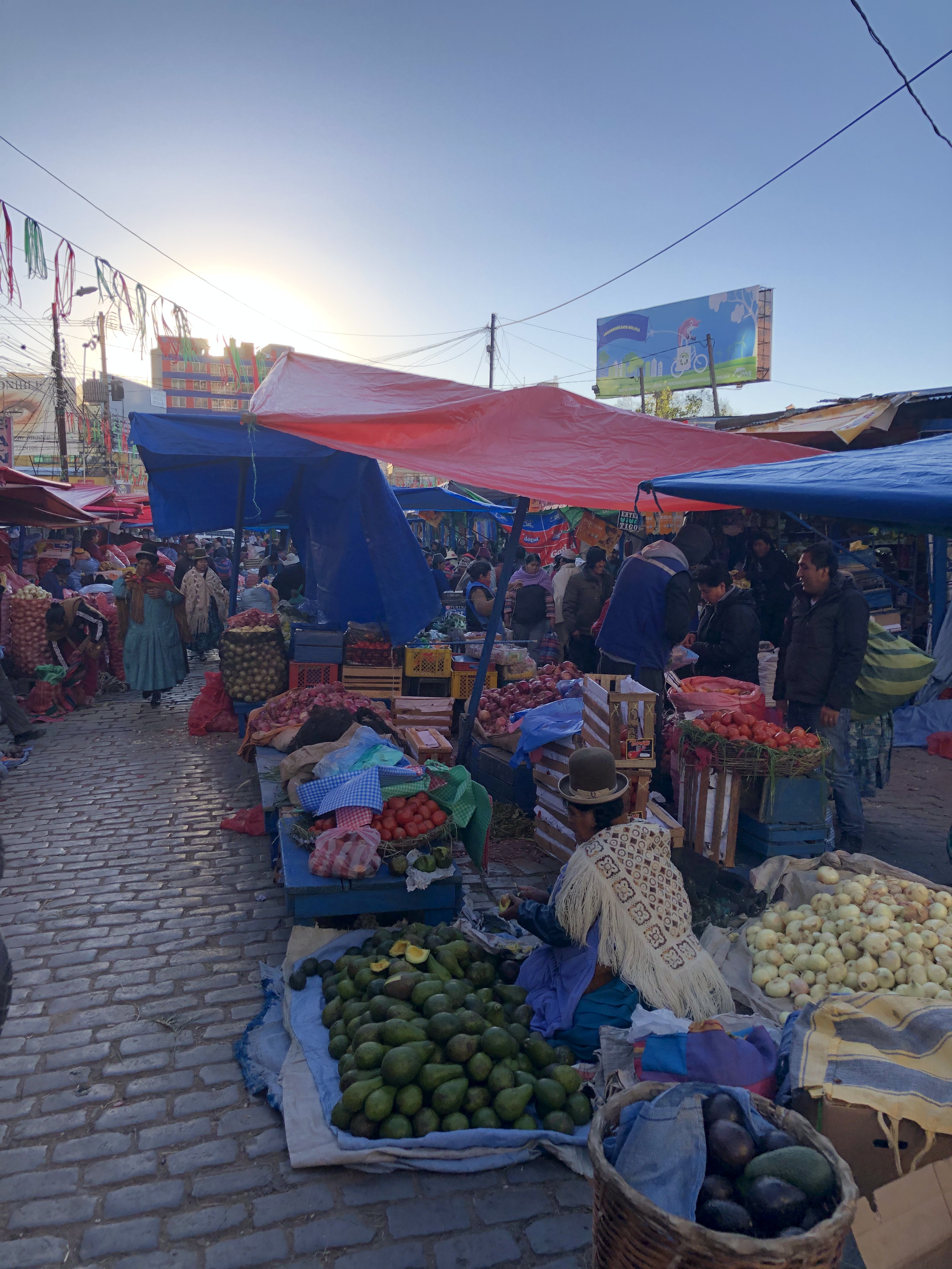 We got up early to travel to Choquequta, where we started the takesi trail. Niall was ill and ended up missing the trek. The rest of us walked to get a collectiva (the most common method of transport in La Paz, and most other of the places we’ve been – I’m writing this a week delayed). Collectiva’s are small communal mini bus ride shares. On the way we walked through a huge food market and I got a huge bag of peas in the pod for the equivalent of about 50p, having my change forced on me (they were very nice, but not as nice as yours grandad!). We lost track of where we were going, and after asking someone we suddenly had an army of old women from the market helping us on where to go. Our Spanish is slowly getting better, through talking to people and constantly looking up words. Bolivia is incredibly cheap, and the people are very honest and helpful.
